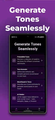 AI Sound osnažuje vas da generišete tonove u širokom spektru od 1 Hz do 22.000 Hz, uz potpunu kontrolu nad talasnim oblikom i jačinom zvuka. Njegov inteligentni pratilac, pokretan veštačkom inteligencijom, nudi vam sugestije za zvukove prilagođene odabranom raspoloženju – bilo da je to stanje mira, intenzivnog fokusa ili bujice energije. Kreirajte sopstvene binauralne zvučne obrasce za lične eksperimente ili jednostavno pristupite pažljivo odabranim tonovima za poboljšanje dobrobiti, relaksaciju ili rutine spavanja, sve to uz precizno manuelno ili klizno podešavanje.