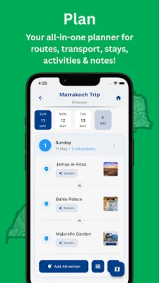 Sa Morokko aplikacijom, detaljno planiranje vaše avanture postaje jednostavno i intuitivno. Kreirajte svoj dnevni raspored, dodajte gradove koje želite posetiti i organizujte aktivnosti po vašoj meri, korak po korak. Otkrijte autentične atrakcije, legendarne znamenitosti i skrivene dragulje u svakom kutku Maroka uz preporučeni sadržaj. Upravljanje finansijama na putu nikada nije bilo lakše: pratite svoje troškove u realnom vremenu i održite budžet pod kontrolom bez muke. Uz to, iskoristite prilagodljive kontrolne liste za pakovanje ili kreirajte sopstvene, kako biste bili potpuno spremni za svaku avanturu koja vas čeka.