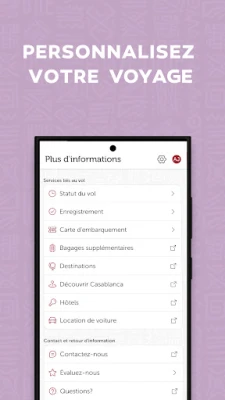 Royal Air Maroc aplikacija je potpuno osvežena kako bi vam pružila još bogatije i prijatnije iskustvo putovanja. Otkrijte sve pogodnosti dizajnirane za vaše najveće zadovoljstvo i udobnost, čineći vaše putovanje besprekornim od početka do kraja.
